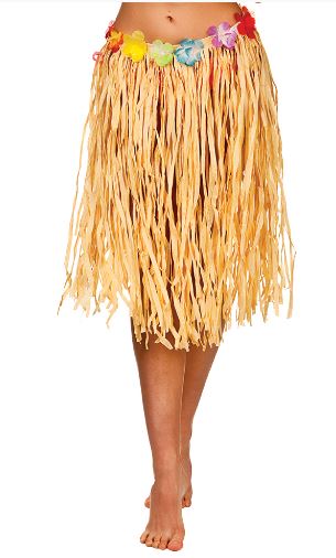 Complete your Hawaiian costume with this long plastic straw-effect natural coloured grass skirt which has an elasticated flower waistband.